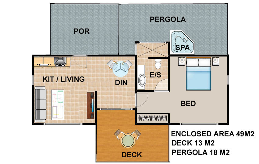 Hillside Haven is a dream Villa for you and your partner to hideaway in. Step inside into the living area and you immediately see through the full length windows a view of the surrounding Whitsunday ranges. The cosy living area includes a 3 seater sofa and a large plasma TV. The fully equipped kitchen includes a dishwasher, convection microwave and induction hot plate for those who like to cook. The dining area is adjacent to the kitchen for that romantic dinner for two while still taking in the view of the valley.
